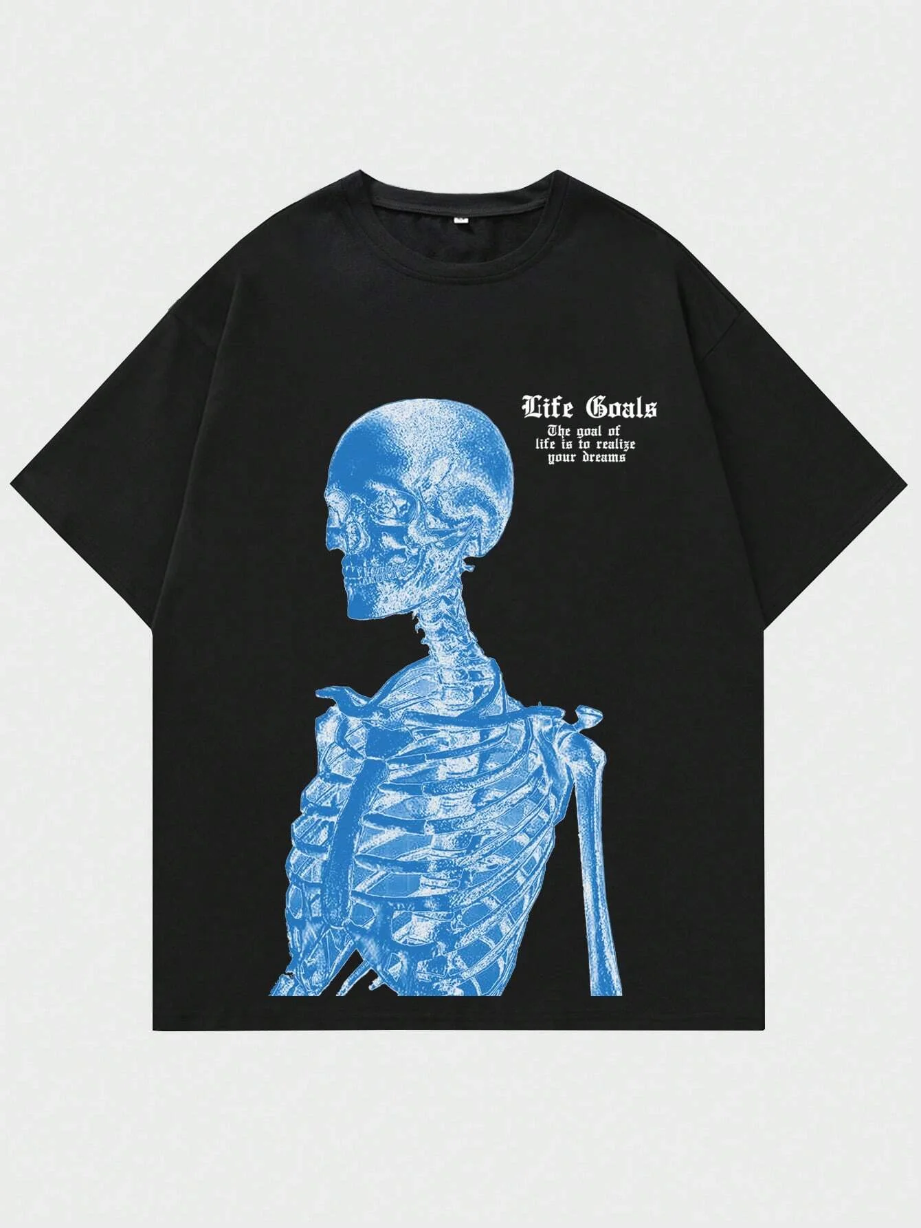 Blue Skeleton Man Life Goals Letter Printing O-Neck Cotton Tops Street Fashion Tees Loose Soft Clothes