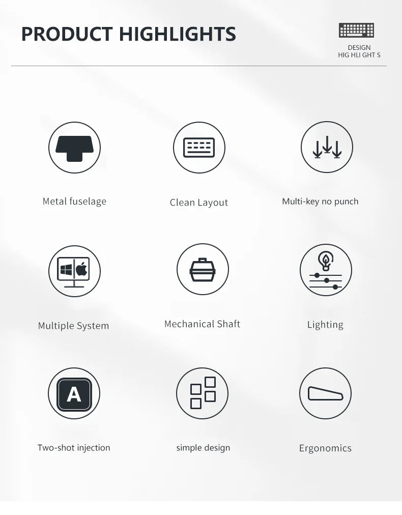 5.Two-color injection suspension keycap, transparent design, anti-fingerprint, anti-oil, gives you soft and comfortable hand feeling.
