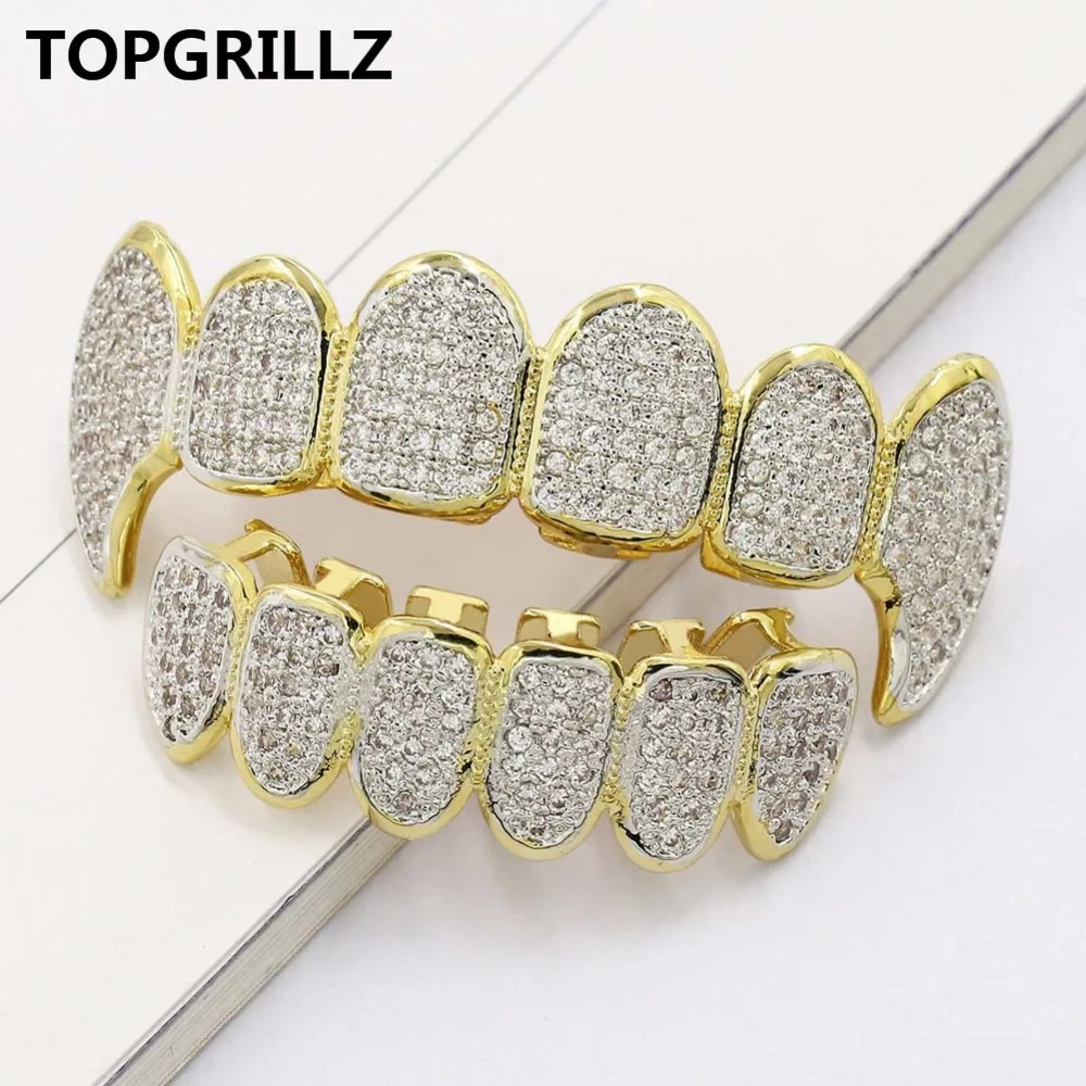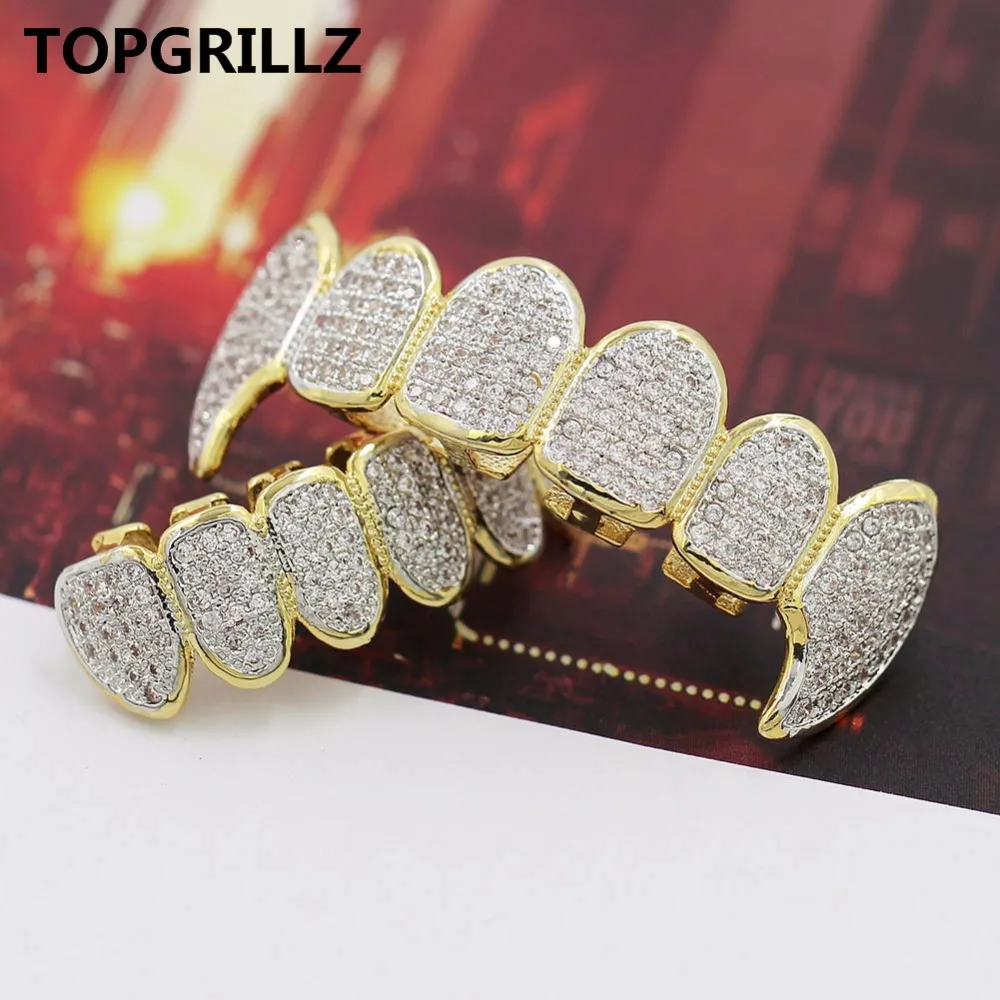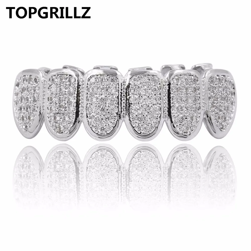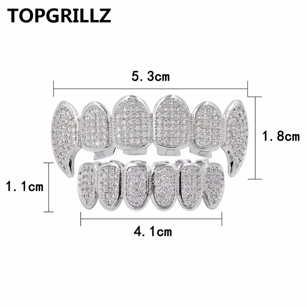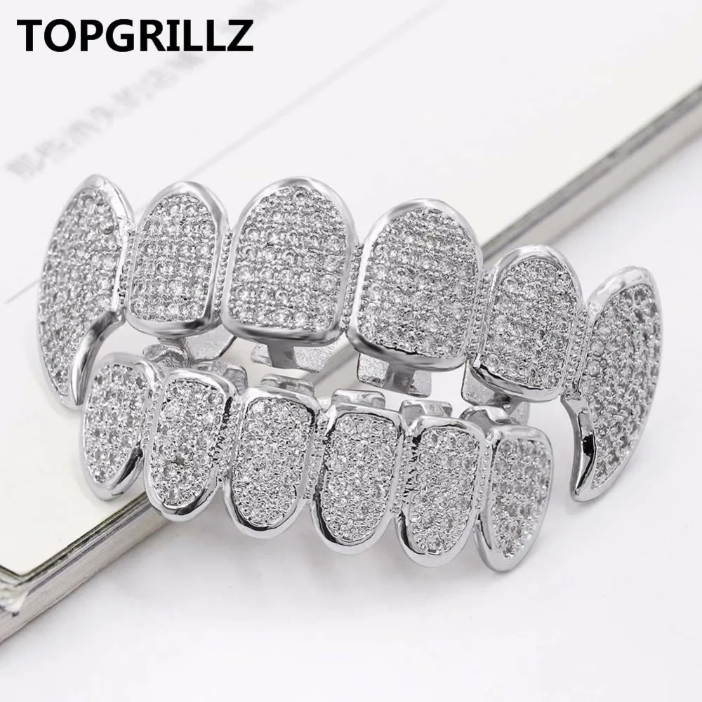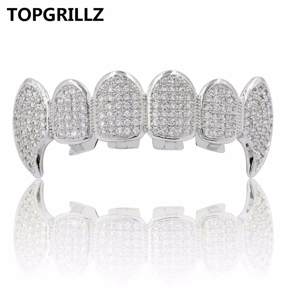 TOPGRILLZ New Fit Silver Plated CZ Micro Pave Top & Bottom GRILL SET Rhodium Teeth Grills Vampire Tooth Grillz